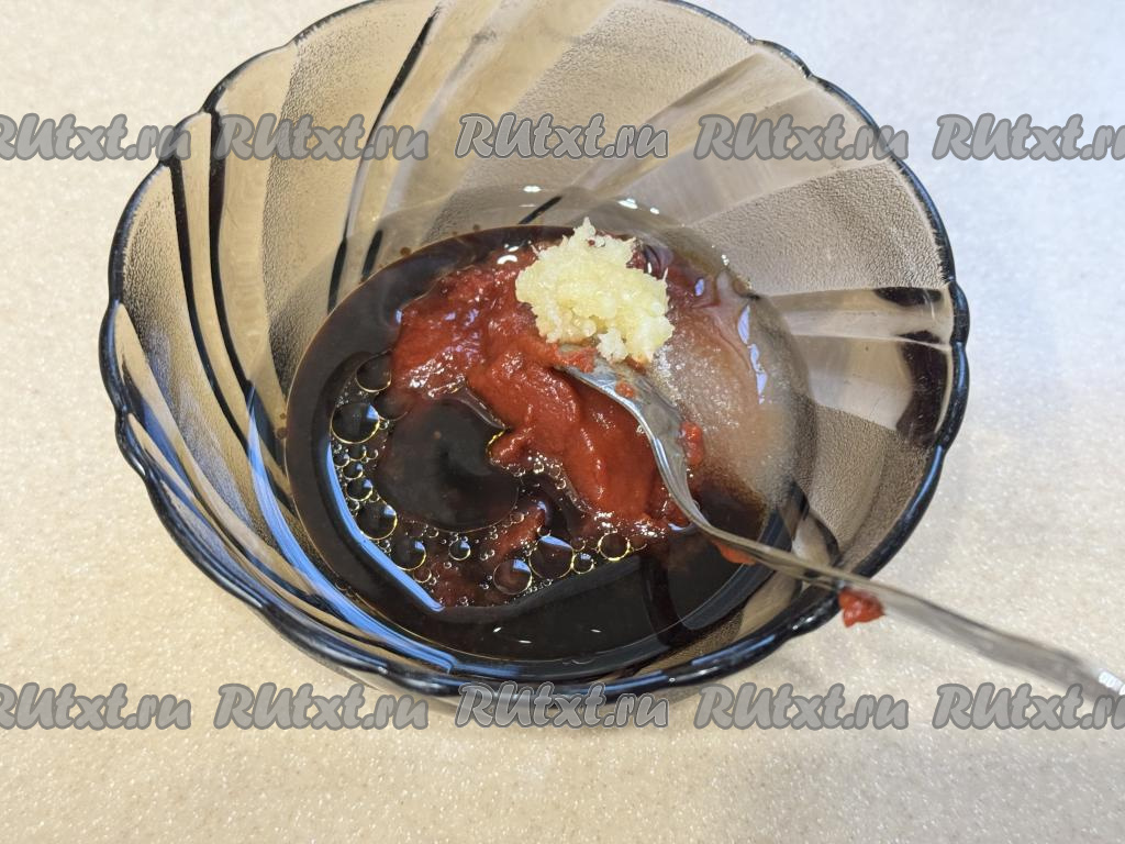 Пока ножки запекаются в аэрогриле, приготовим соус. Для этого в миске нужно соединить растительное масло, соевый соус, томатную пасту, сахар и пропущенный через пресс чеснок, хорошо перемешать и соус для смазывания чупа-чупсов из куриных ножек готов.