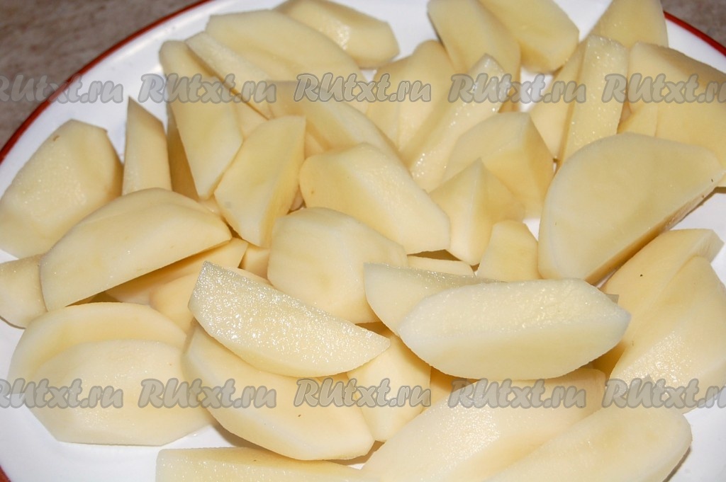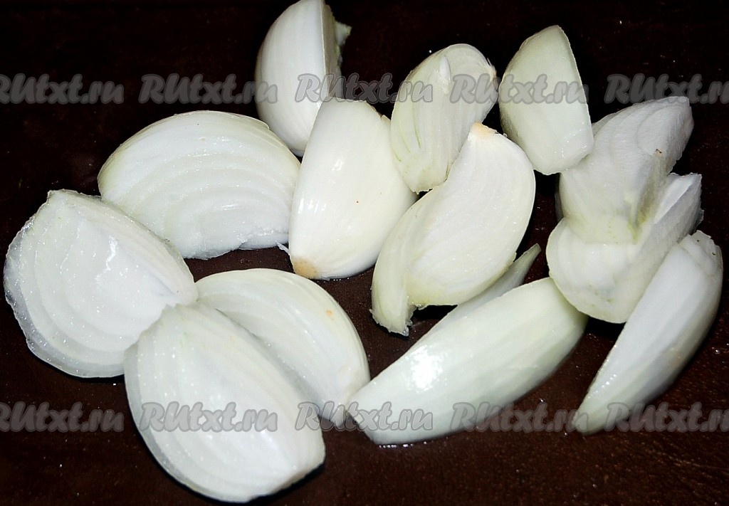 Лук репчатый очистить и тоже нарезать на четвертинки.