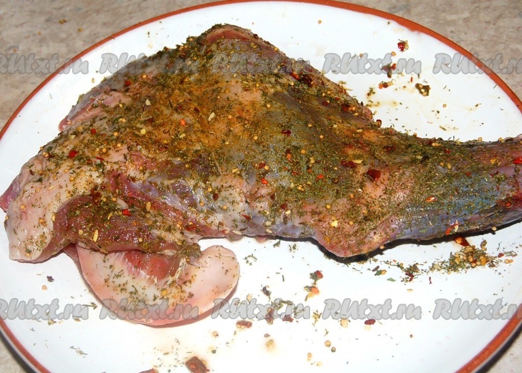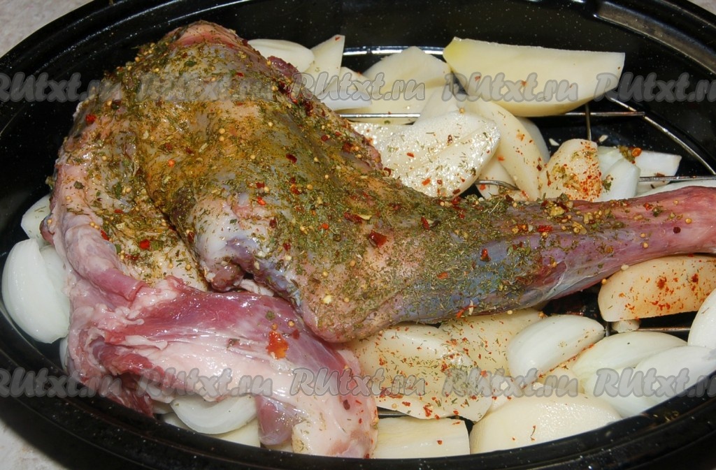 Баранью ногу посолить и посыпать специями, втереть их руками по всей поверхности мяса.