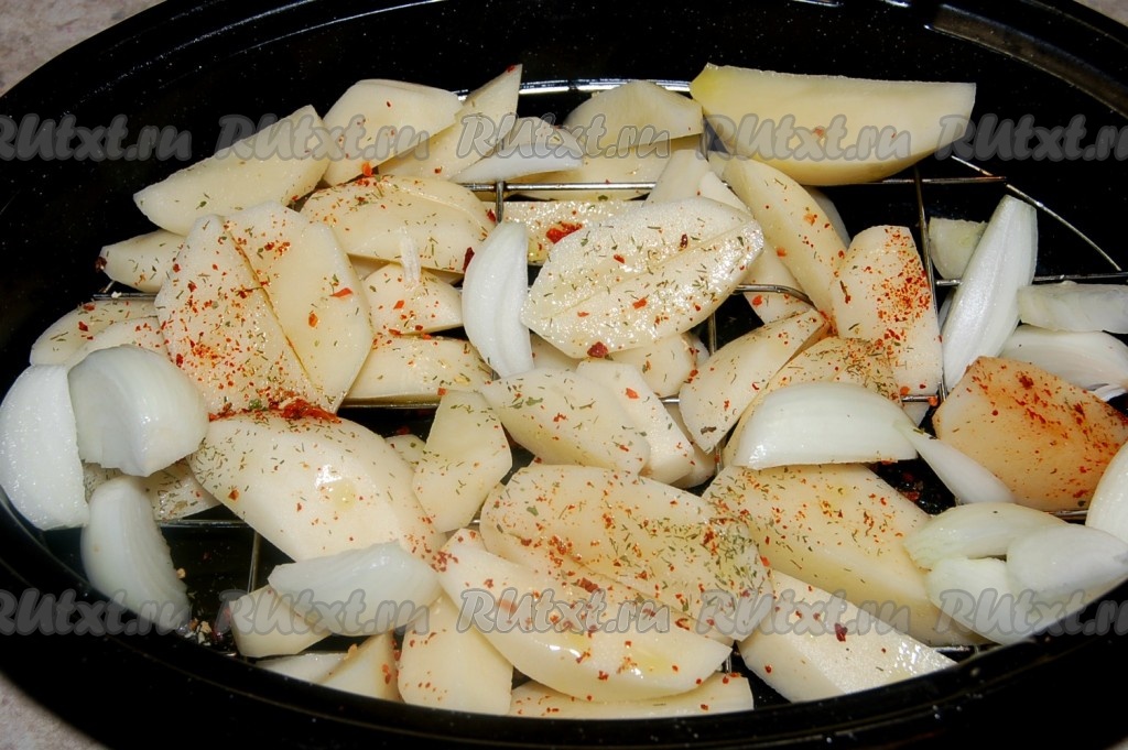 Нарезанные картошку и лук сложить в форму для запекания (я сложила в жаровню), посолить, посыпать специями.
