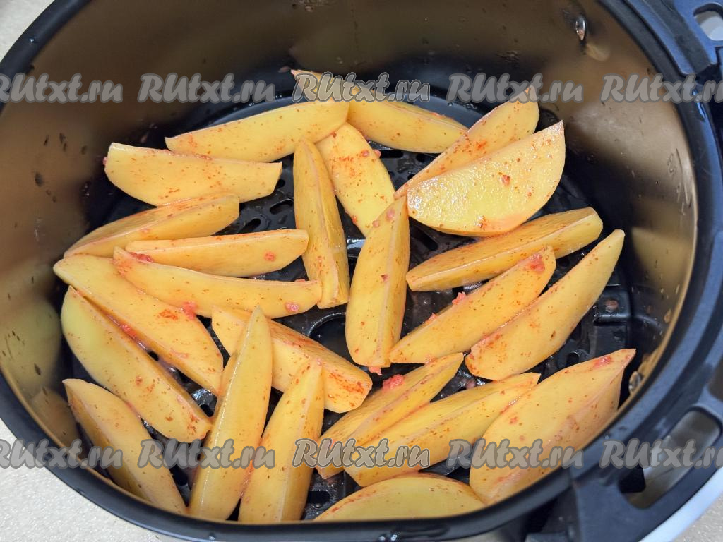 Выложить дольки картошки в чашу аэрогриля, желательно в один слой.