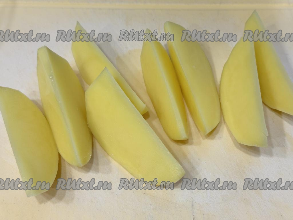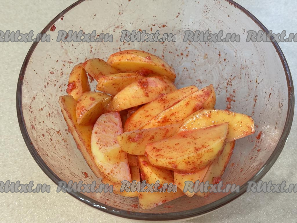 Тщательно перемешать дольки картошки, покрывая их солью и специями со всех сторон.