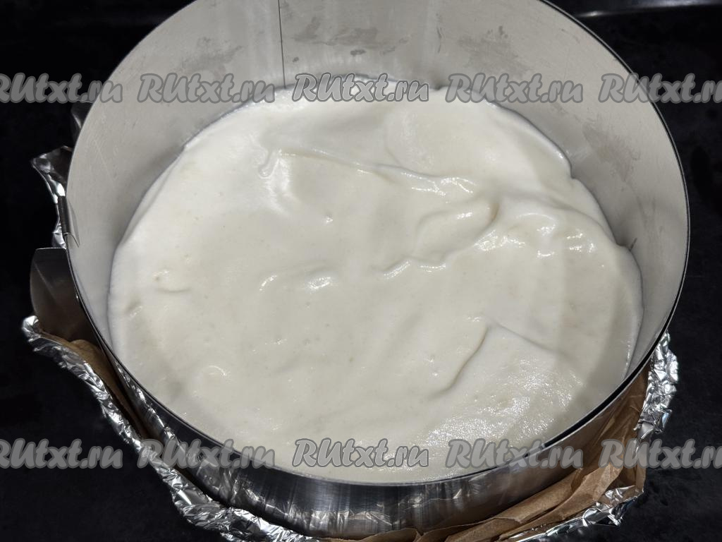Переложить тесто в разъёмную форму диаметром 20 сантиметров. Разровнять поверхность теста лопаткой.