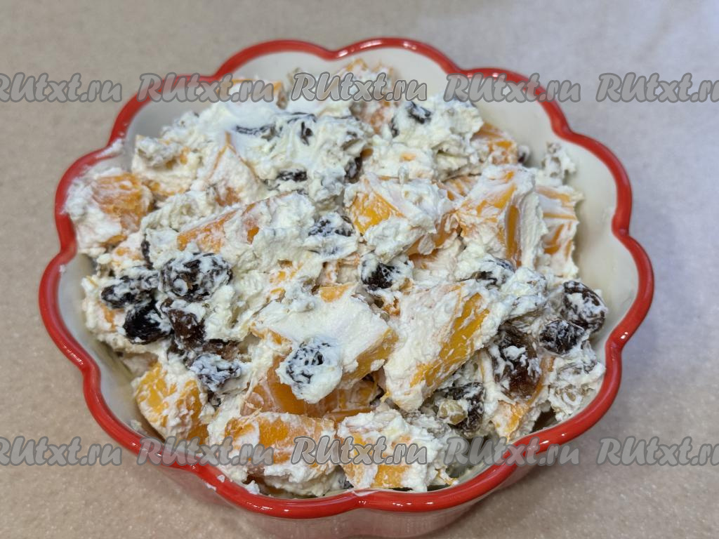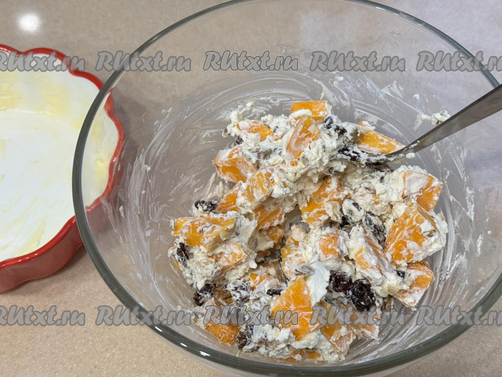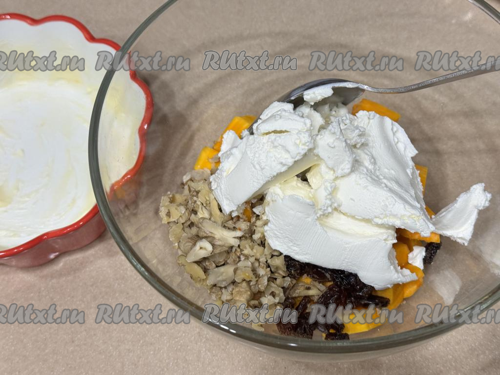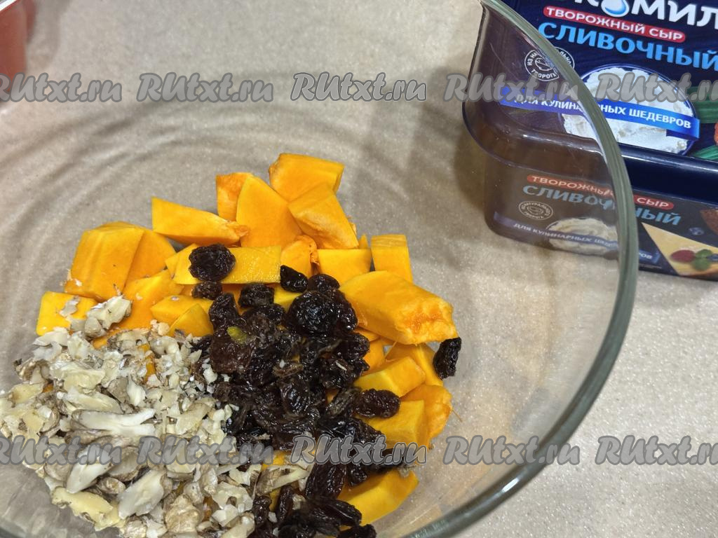 Перемешать содержимое миски, равномерно покрывая тыкву творожным сыром со всех сторон и равномерно распределяя орехи и изюм. При желании можно добавить немного сахара, я сахар не добавляла, потому что сладости тыквы и изюма, на мой вкус, вполне достаточно.