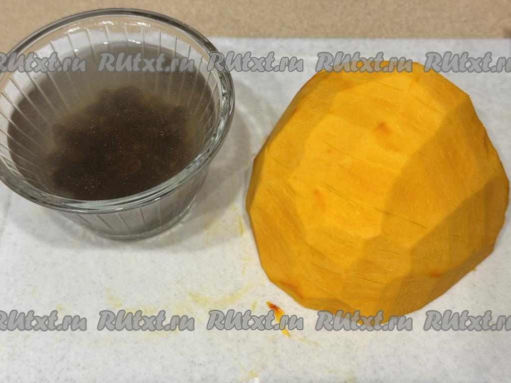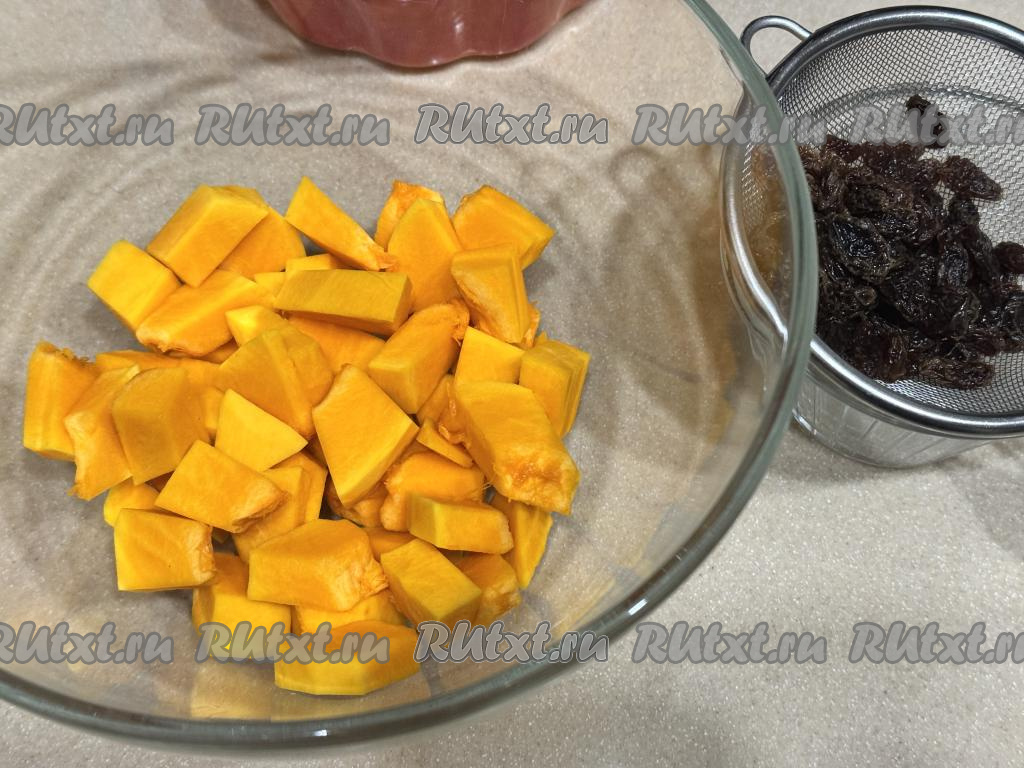 По прошествии 5 минут откинуть изюм на сито, чтобы стекла лишняя вода. Очищенную тыкву нарезать на кубики со стороной 2 сантиметра. Выложить нарезанную тыкву в глубокую миску.