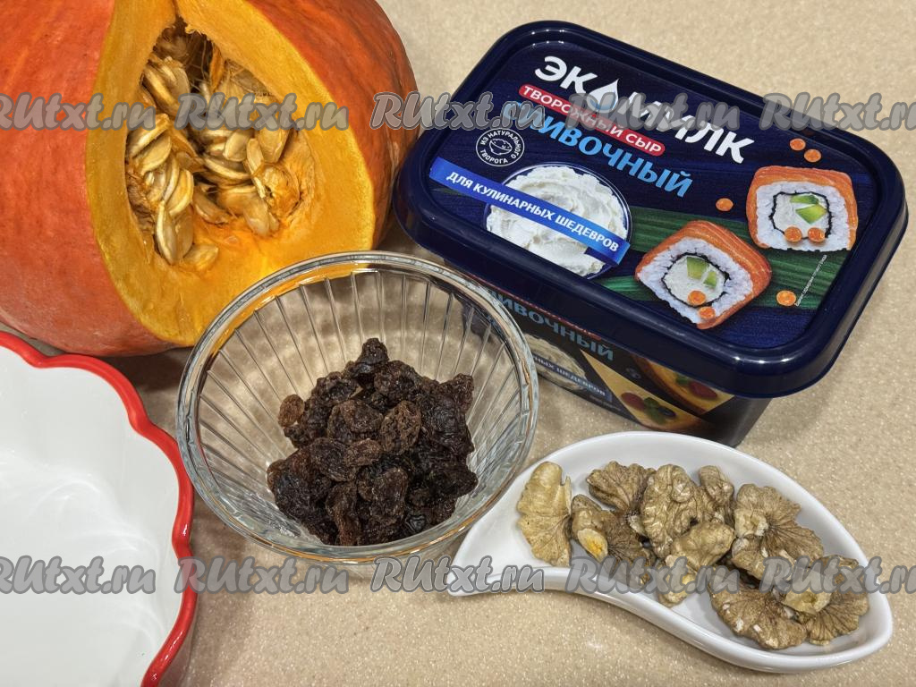 Предлагаю разнообразить меню и запечь в духовке тыкву с творожным сыром, изюмом и орехами. Это вкусное, насыщенное, аппетитное блюдо можно подать к столу в качестве десерта. При желании перед запеканием можно добавить сахар, но мне хватило сладости тыквы и изюма. Уверена, нежный вкус тыквы, запечённой с творожным сыром, понравится многим!