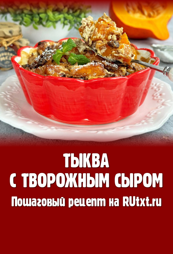 Тыкву, смешанную с творожным сыром, орехами и изюмом, выложить в подготовленную форму для запекания, влить 50 миллилитров воды. Накрыть форму фольгой и отправить в духовку, разогретую до 200 градусов, на 25 минут (до готовности тыквы). Для того чтобы проверить готовность тыквы, нужно проколоть кусочек вилкой, если тыква прокалывается легко, значит она готова. Если же тыква ещё твердовата (продолжительность приготовления зачастую зависит от сорта тыквы), тогда увеличьте время запекания на 5-10 минут.