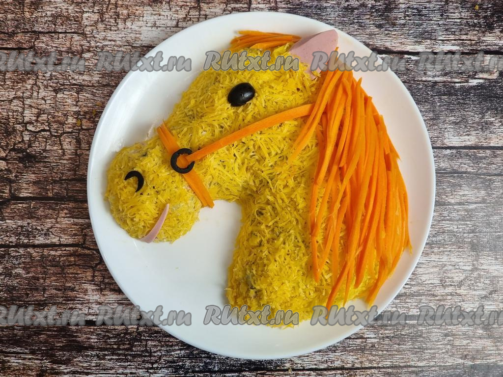 Салат "Оливье" в виде лошади готов, его можно сразу подавать к столу. Выглядит такой тематический салат очень эффектно и будет одним из самых вкусных и запоминающихся блюд на вашем новогоднем столе!