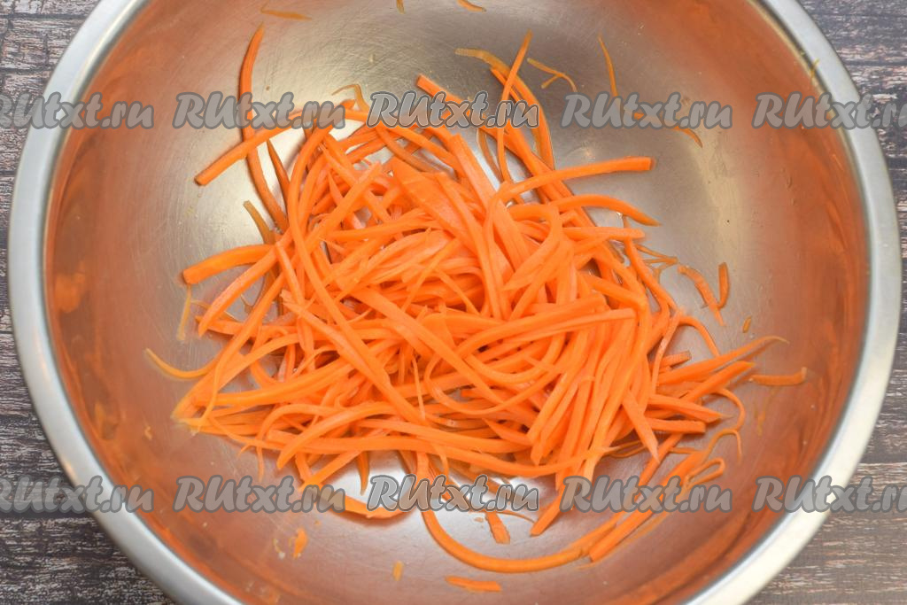 Картофель вымыть, не очищая от кожуры, выложить в кастрюлю, залить полностью водой и поставить на сильный огонь, после закипания варить до готовности (минут 25, готовая картошка будет легко прокалываться вилкой). Яйца отварить в течение 10 минут после закипания воды. Пока отвариваются яйца и картошка, нужно приготовить морковку для украшения лошади. Если у вас есть корейская морковка, то можно взять её. У меня корейской морковки не было дома, поэтому я взяла достаточно крупную сырую морковь, очистила её, натёрла на тёрке для корейской морковки (если такой тёрки нет, можно нарезать ножом на тонкие полоски), добавила 0,5 чайной ложки соли, тщательно перемешала и оставила просолиться на 10-15 минут. Морковка пустила сок и стала мягкой. Выделившийся сок слить. Ни сырая, ни отварная морковка не подойдут, так как они ломаются при сильном изгибе.