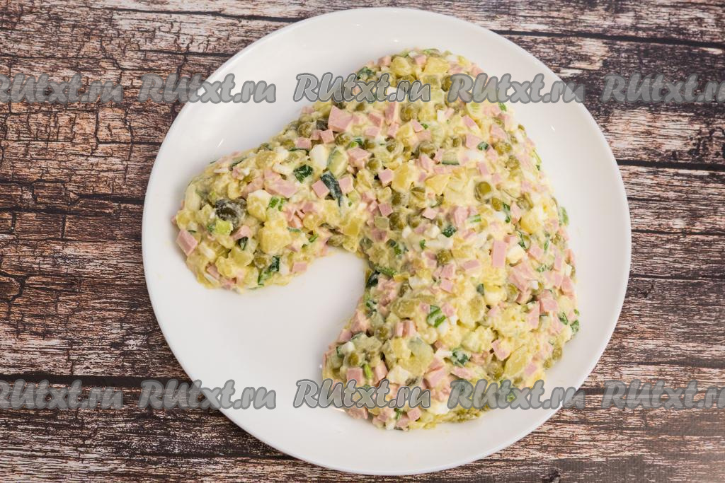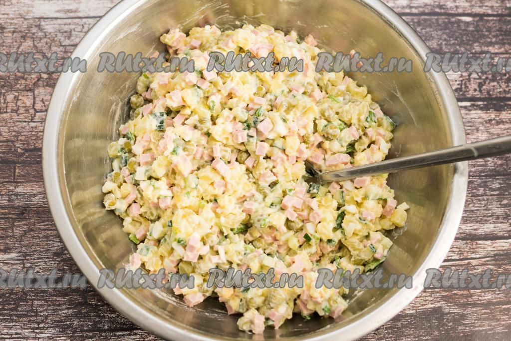 Заправить салат "Оливье" майонезом, подсолить по вкусу.