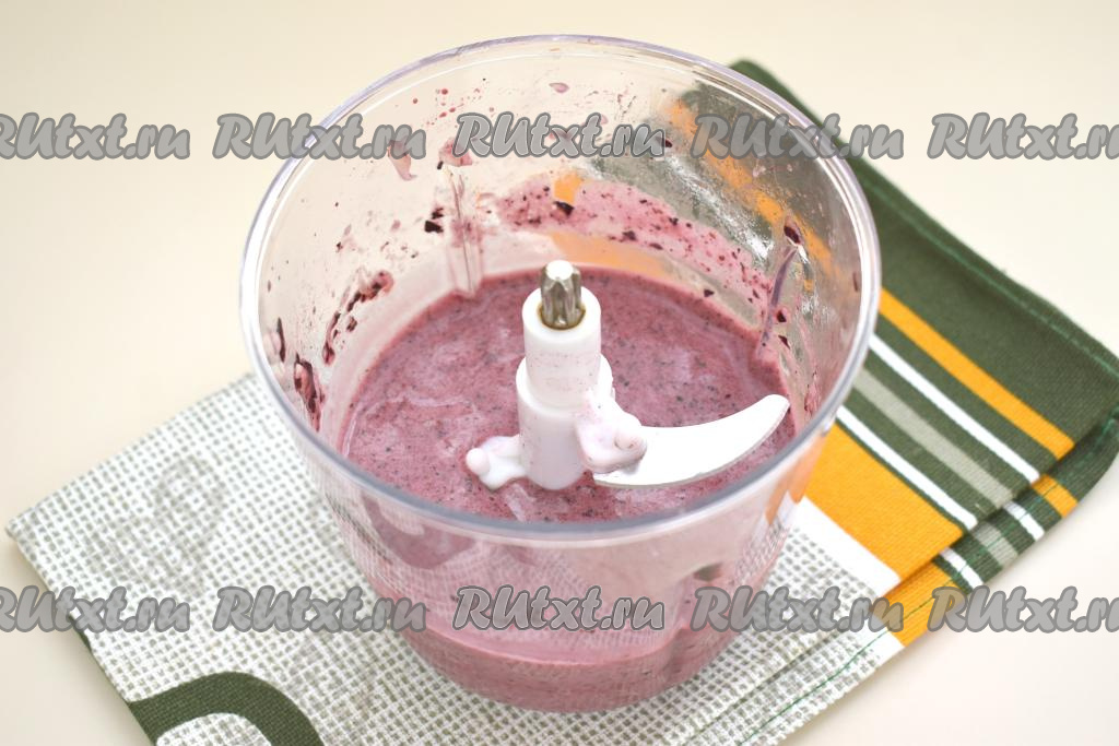 Взбиваем банан и голубику блендером до однородности. Если нет стационарного блендера, можно взбить банан с голубикой до однородности погружным блендером.