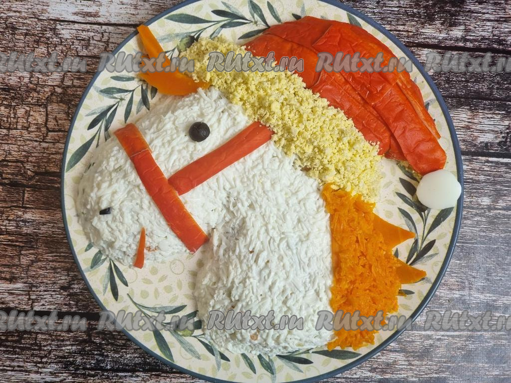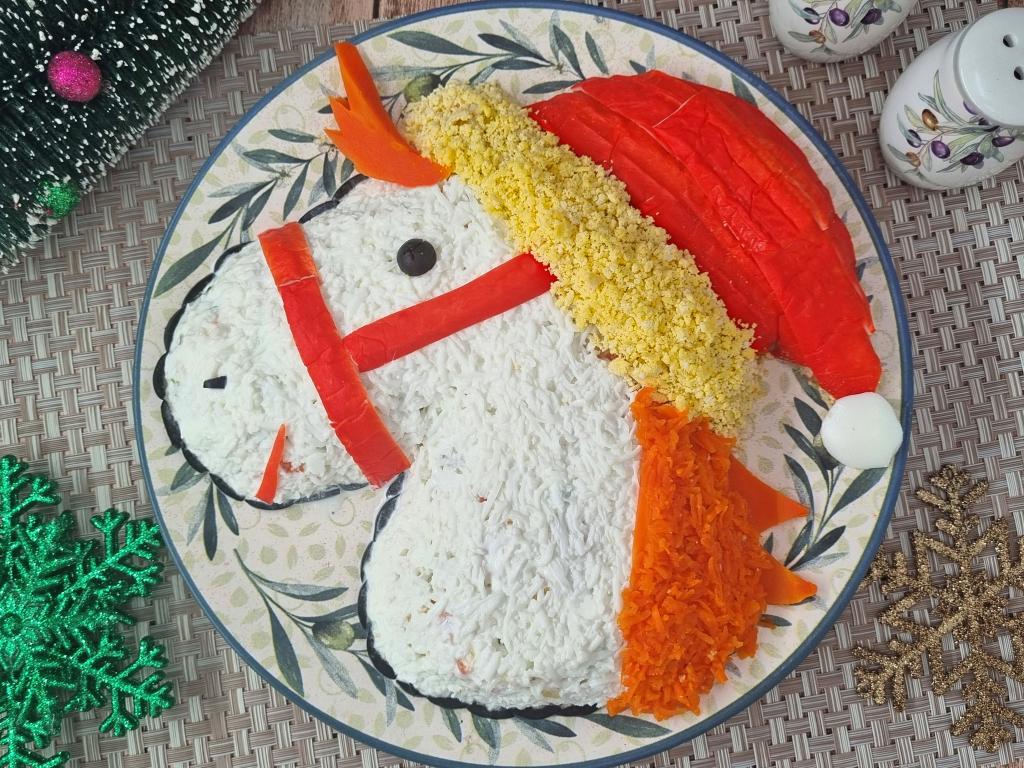 На плоскую большую тарелку выложить салат в виде головы лошади в шапке.