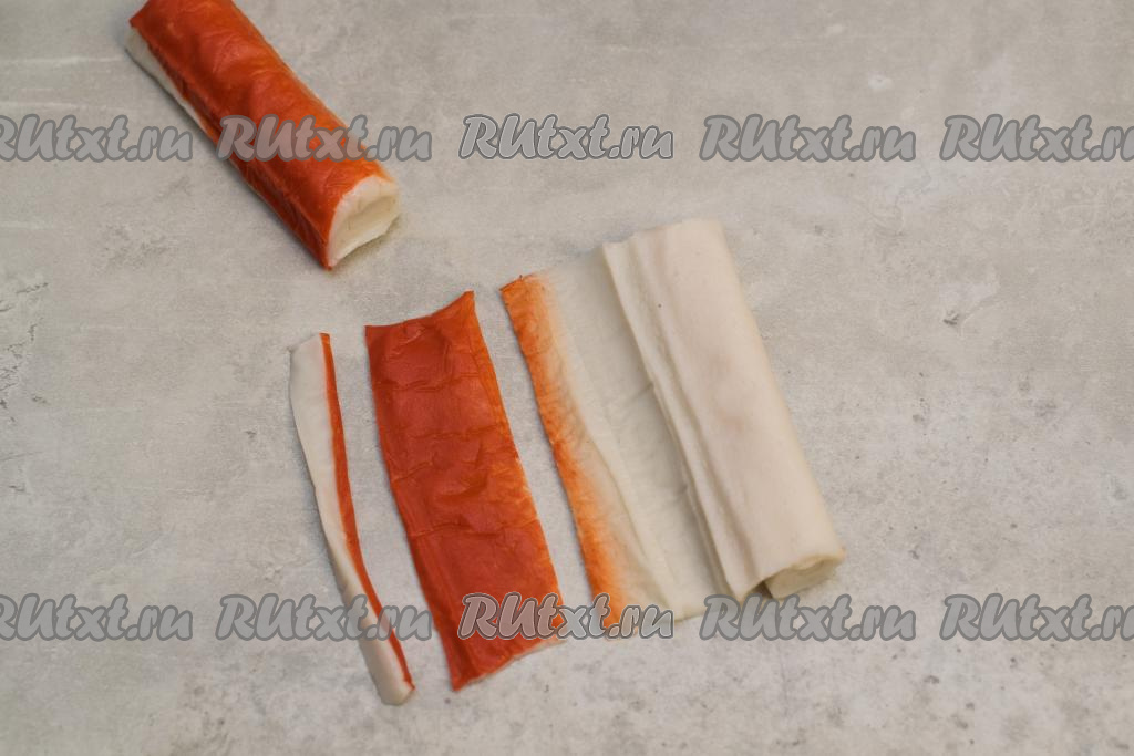 Крабовые палочки, если они заморожены, нужно заранее разморозить. Каждую палочку освободить от слюды, немного раскрутить. Отрезать красную часть каждой палочки, отложить в сторону. Красная часть крабовых палочек понадобится для оформления новогоднего салата "Лошадь".