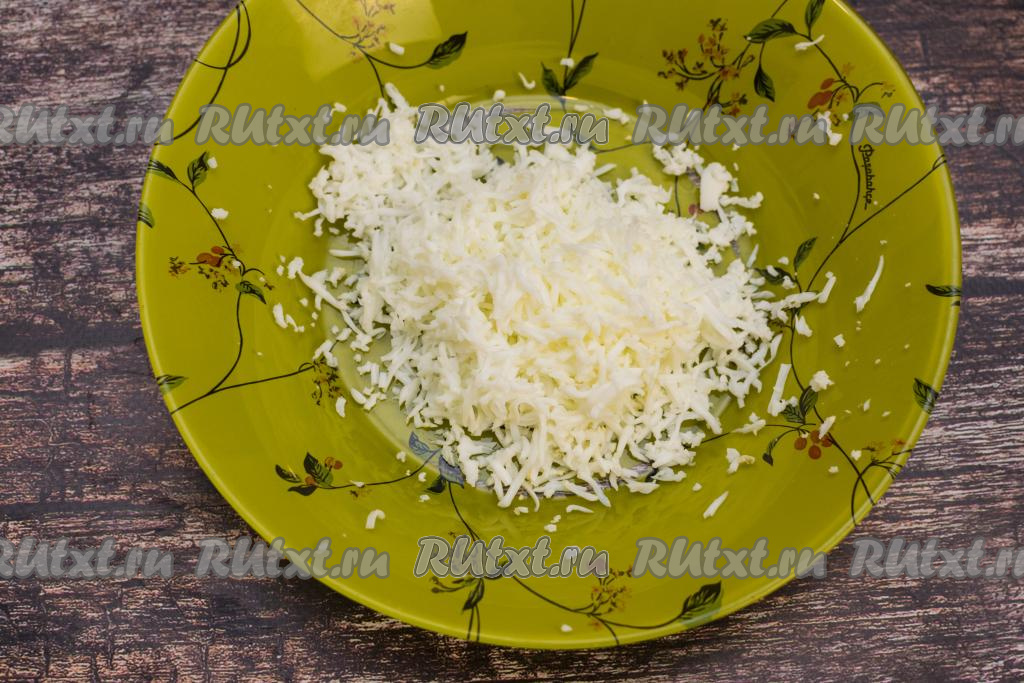 Из части белка вырезать кружок - это будет помпончик шапки. Остальные белки натереть на мелкой тёрке.