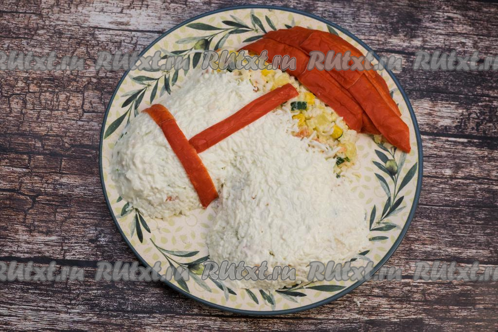 Сбрую и шапку лошади сделать из отложенных кусочков крабовых палочек.