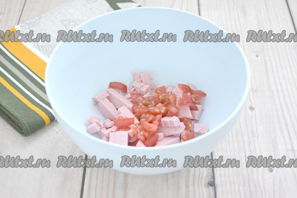 Помидор моем, нарезаем мелко, добавляем в миску с колбасой.