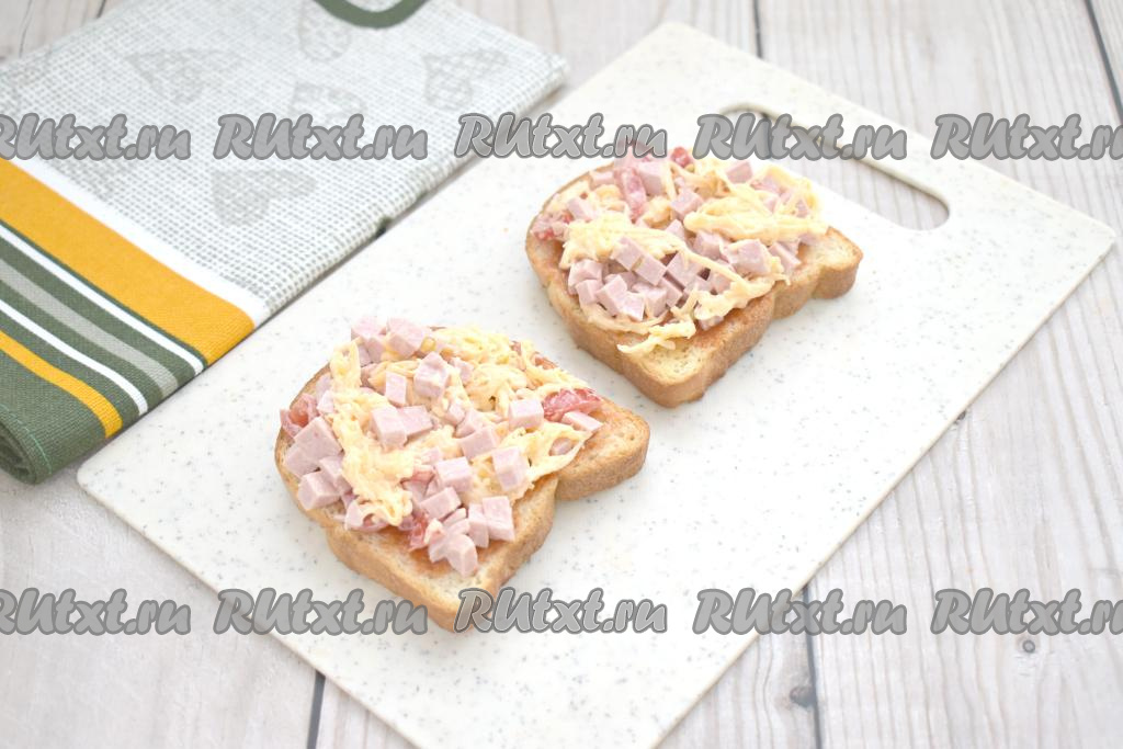 Колбасно-сырную начинку зрительно делим на 4 части. На каждый подсушенный кусок хлеба, смазанный соусом, выкладываем 1/4 часть начинки.