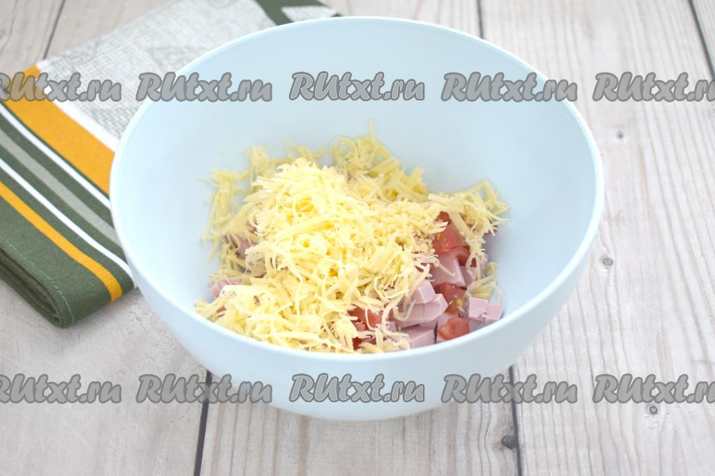 Сюда же выкладываем сыр, натёртый на крупной тёрке.