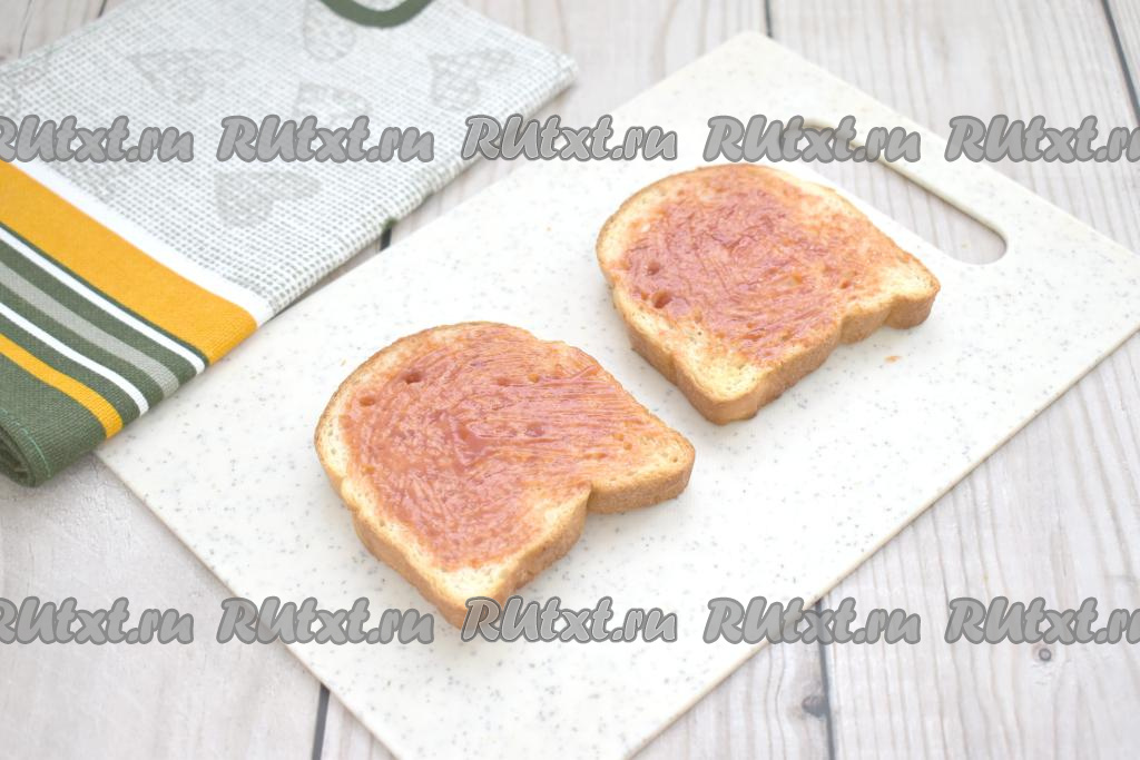 Чашу с тостовым хлебом достаём из аэрогриля. Вынимаем хлеб из чаши и хрустящей (подсушенной) стороной вниз кладём на разделочную доску. Смазываем каждый кусок хлеба 1 чайной ложкой томатного соуса (или кетчупа).