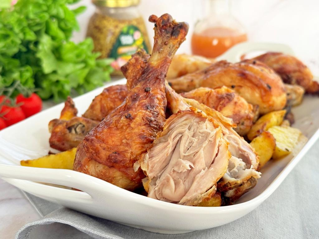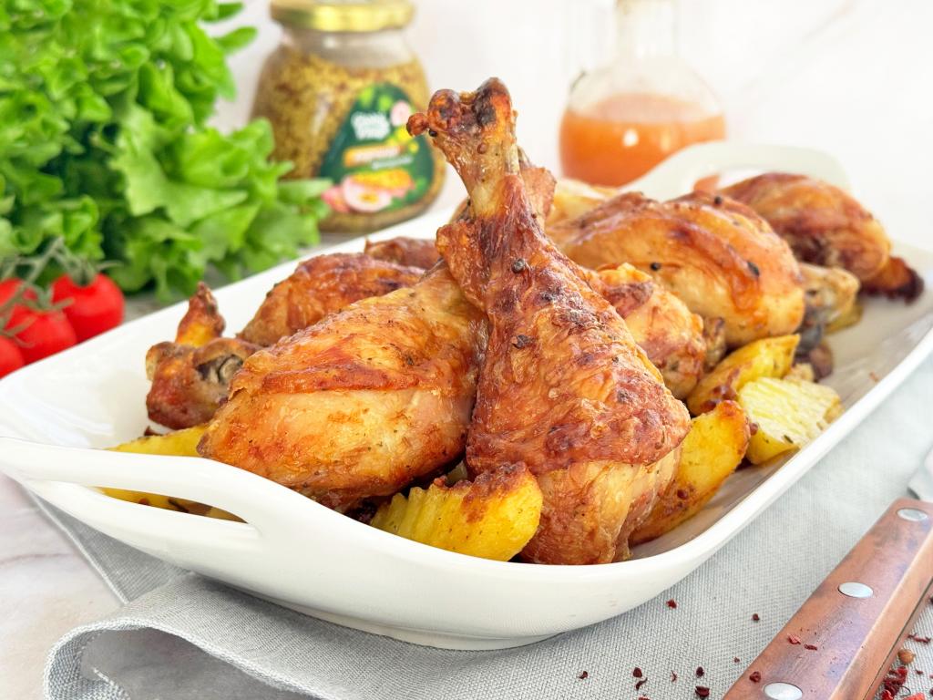 В аэрогриле можно приготовить много сытных и вкусных блюд для семейного обеда или ужина. В этот раз делюсь рецептом запекания куриных ножек с картошкой в аэрогриле. Ножки получаются очень нежными, сочными, покрытыми румяной корочкой, картошка в процессе приготовления пропитывается мясными соками, становится аппетитной снаружи и мягкой внутри. Мне нравится этот рецепт и тем, что блюдо получается сытным и вкусным, и тем, что одновременно в аэрогриле готовятся и мясо, и гарнир к нему.