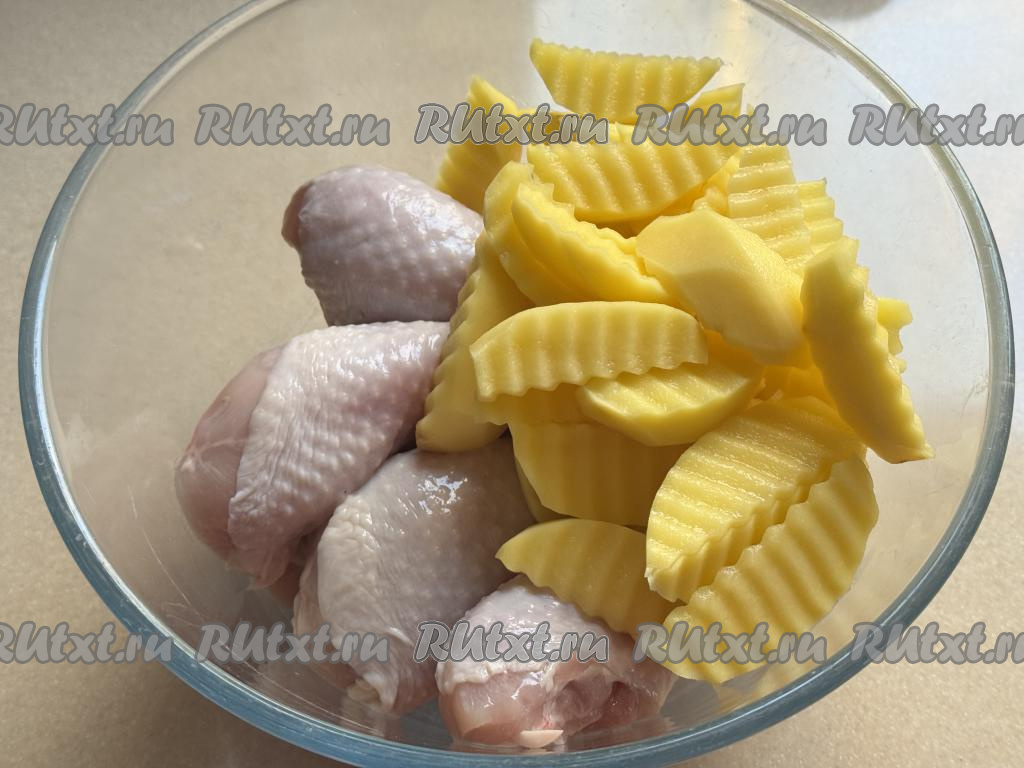 Картошку нарезать на средние дольки примерно одинакового размера (я использовала для нарезки специальный рифлёный нож). В глубокую миску выложить куриные ножки и дольки картофеля.