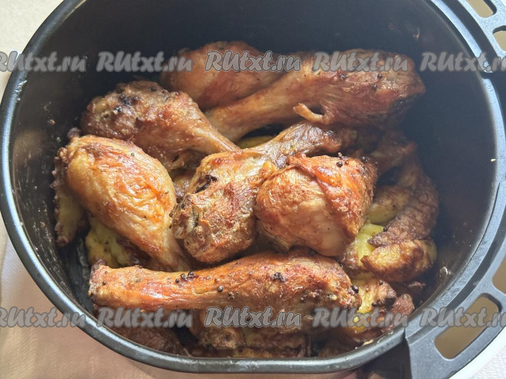 Выставить на аэрогриле температуру 180 градусов и время - 1 час. В аэрогриле нагрев идёт только сверху, поэтому для равномерного приготовления блюда нужно каждые 10-15 минут доставать чашу и аккуратно перемешивать картофель и голени. Готовность проверяйте и по картошке, и по частям курицы. Готовая картошка должна легко прокалываться вилкой, а при прокалывании куриной ножки должен вытекать прозрачный сок без примесей крови.