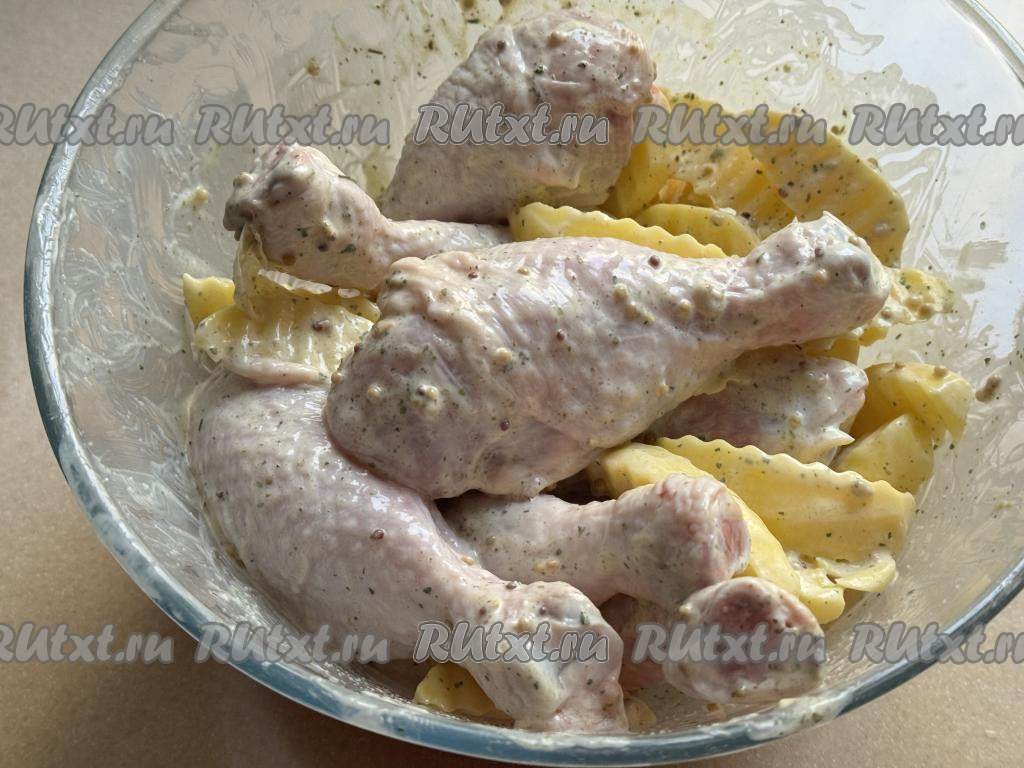 Хорошо перемешать дольки картофеля и куриные ножки, покрывая их специями и майонезом со всех сторон.
