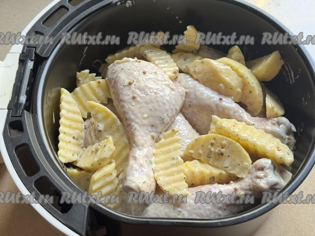 Из чаши аэрогриля убрать решётку. Выложить в чашу аэрогриля дольки картошки с куриными ножками.