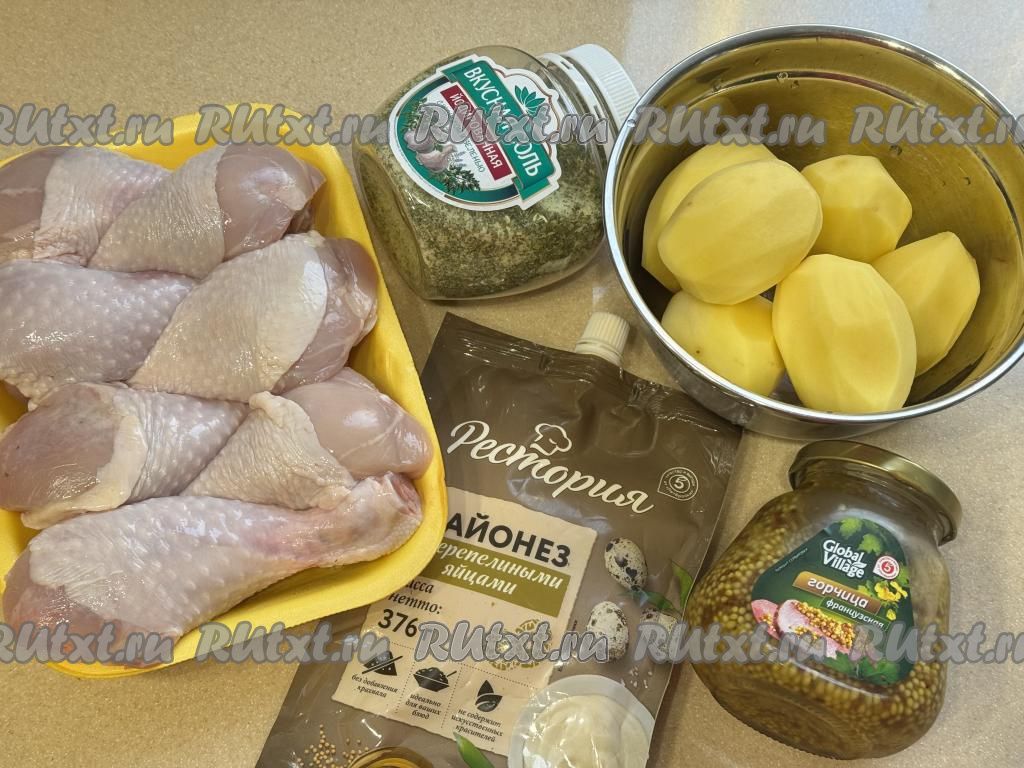 Подготовить продукты. Куриные ножки промыть водой, немного обсушить. Картошку очистить.