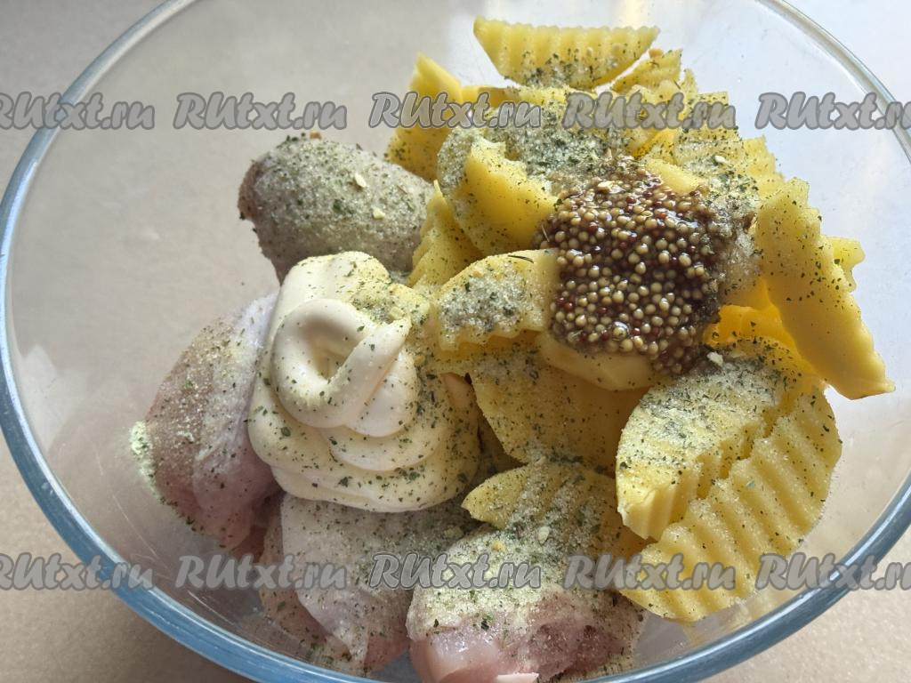 К ножкам и картошке добавить майонез, соль, специи, по желанию, горчицу.