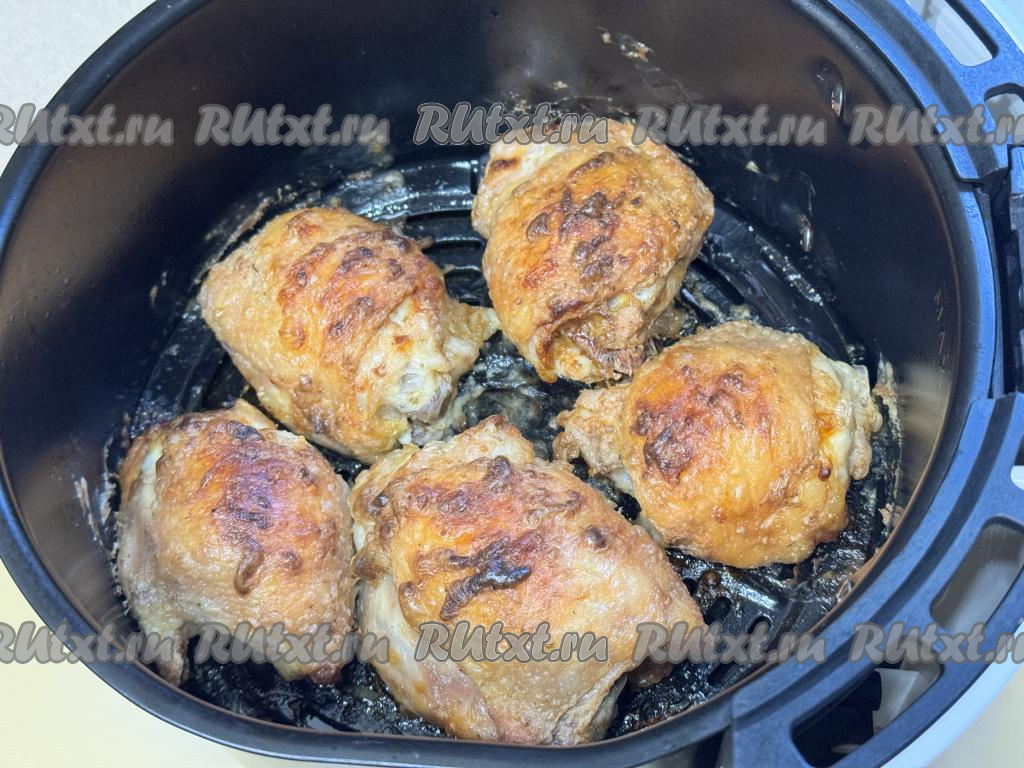 Куриные бёдра, замаринованные в майонезе, выложить на решётку в чашу аэрогриля. Выставить режим 200 градусов на 10 минут.