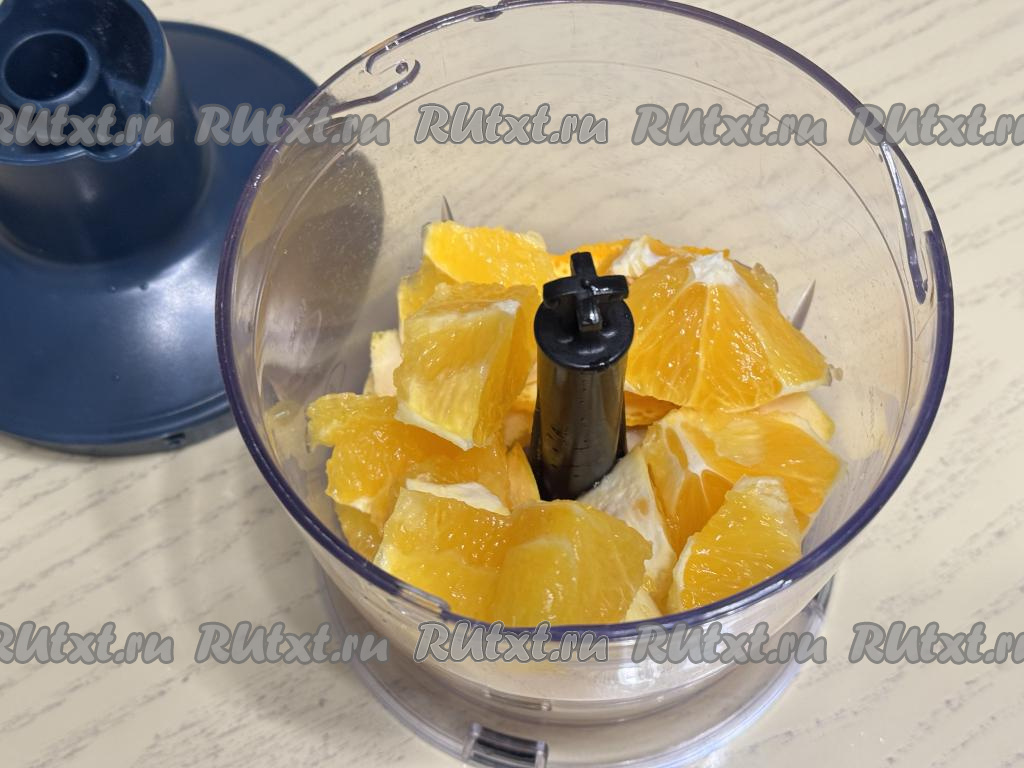 Пробить массу до однородного состояния. Если нет измельчителя, можно мякоть апельсина с жёлтыми корочками измельчить до однородности погружным блендером.
