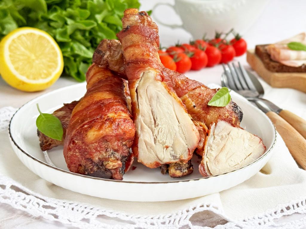 Аэрогриль позволяет приготовить немало аппетитных, вкусных мясных блюд. В этот раз решила запечь в аэрогриле куриные ножки, завёрнутые в полоски бекона. Готовится это блюдо достаточно просто. Ножки получаются очень вкусными, ароматными, сочными и нежными. Такие куриные ножки можно подать с любым гарниром или с салатом из свежих овощей.