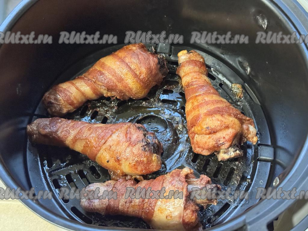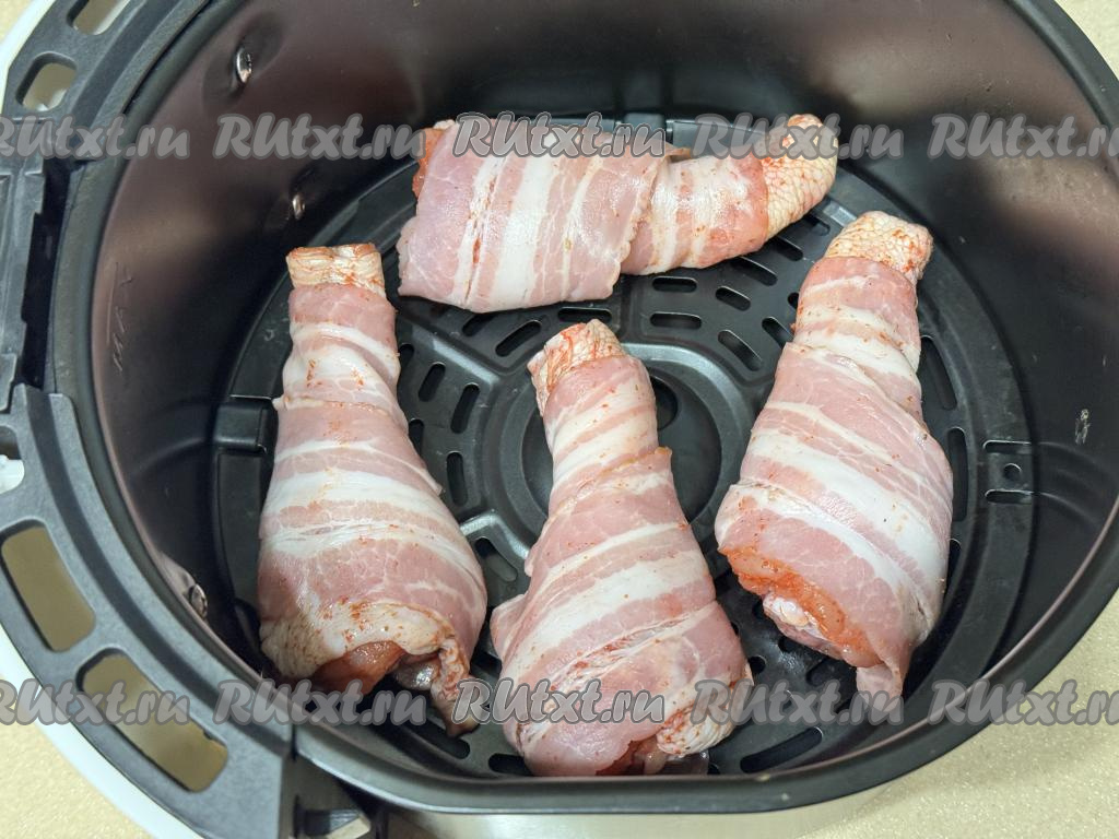 Куриные ножки, завёрнутые в бекон, выложить в чашу аэрогриля на решётку.