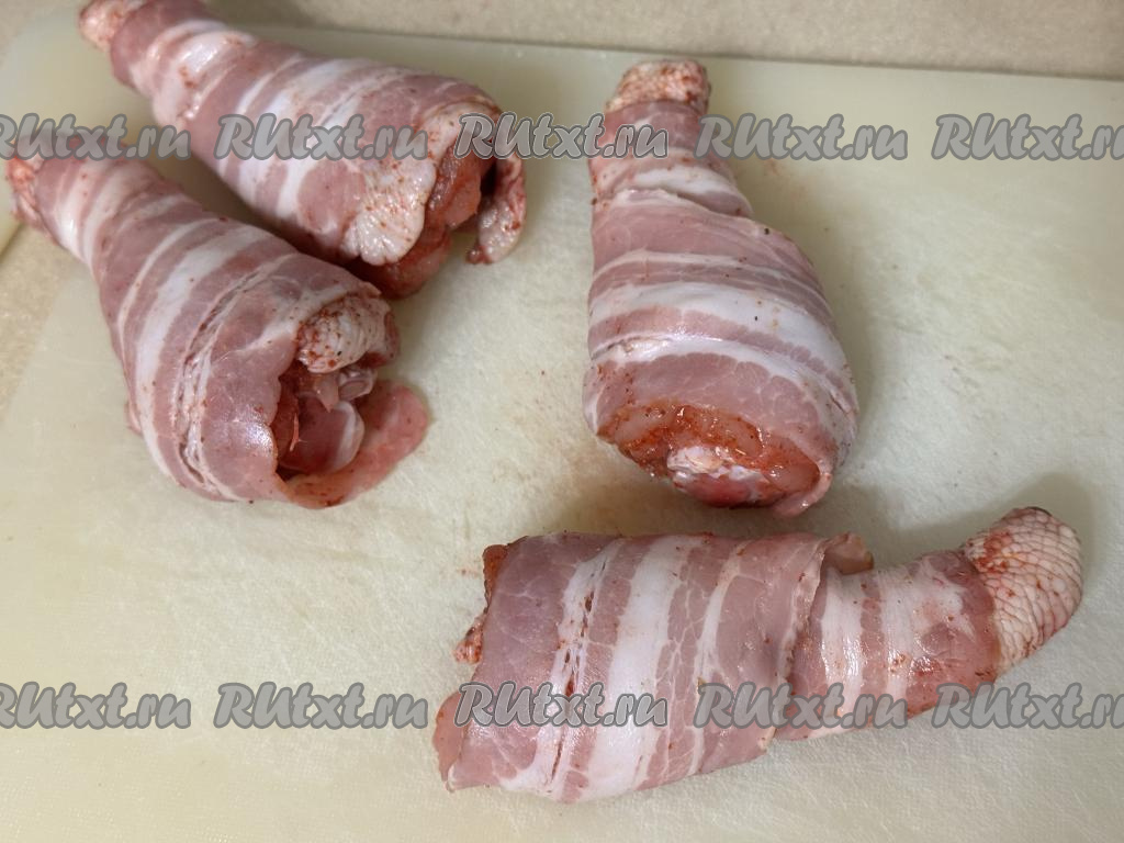 Я купила бекон, уже нарезанный на тонкие полоски. Если вы купили кусок бекона, тогда нарежьте его на тонкие полоски. Каждую куриную ножку полностью завернуть в полоску бекона, накручивая её немного внахлёст.