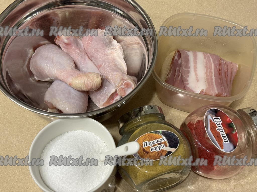 Подготовить продукты. Куриные ножки промыть водой, обсушить. Бекон можно взять любой, я купила сырокопчёный.