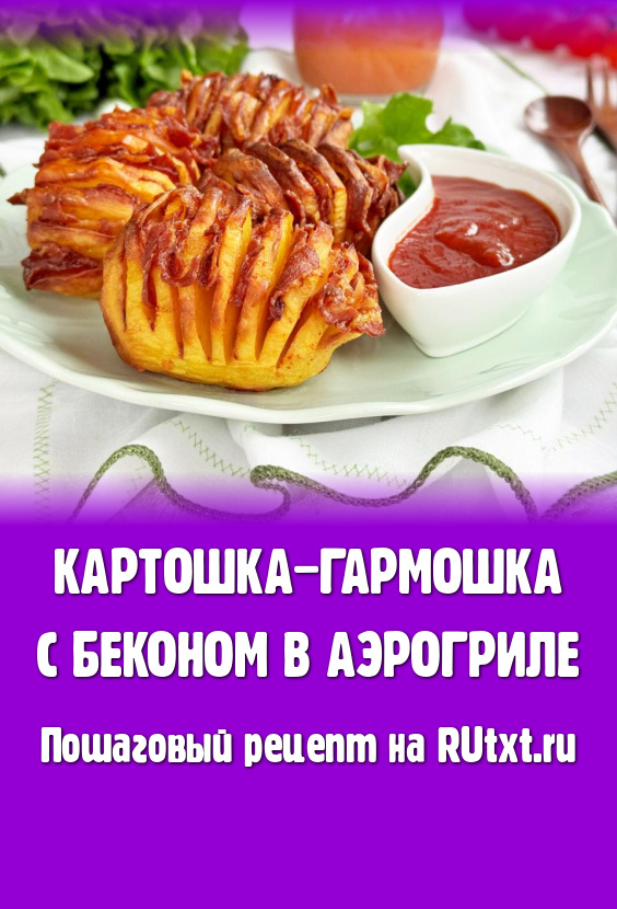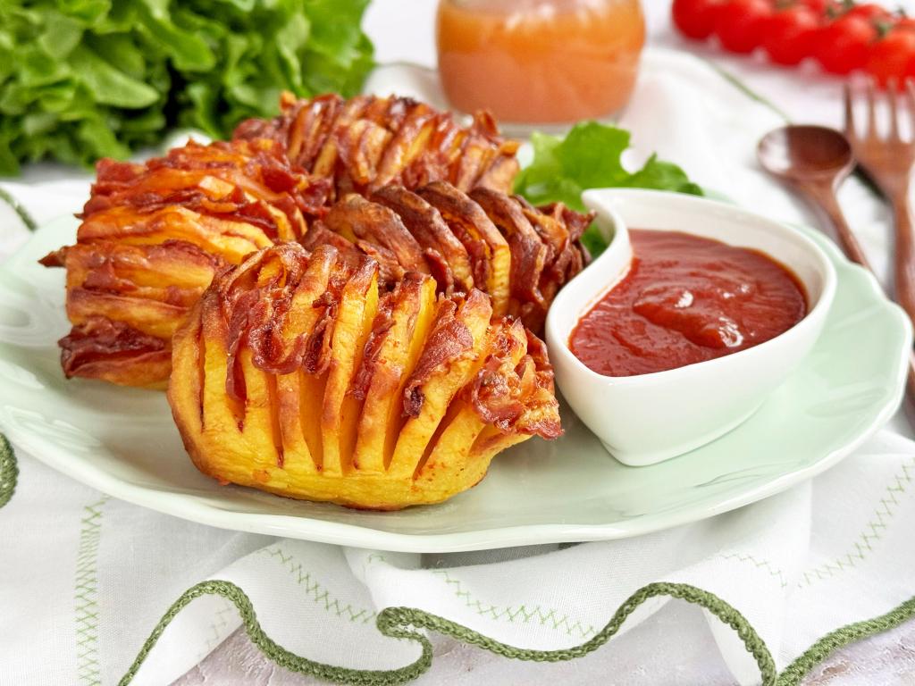 Готовую вкусную, аппетитную картошку-гармошку с беконом переложить из чаши аэрогриля на тарелку и, дополнив любимым соусом, в горячем виде подать к столу.
