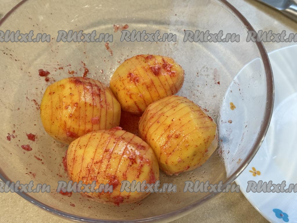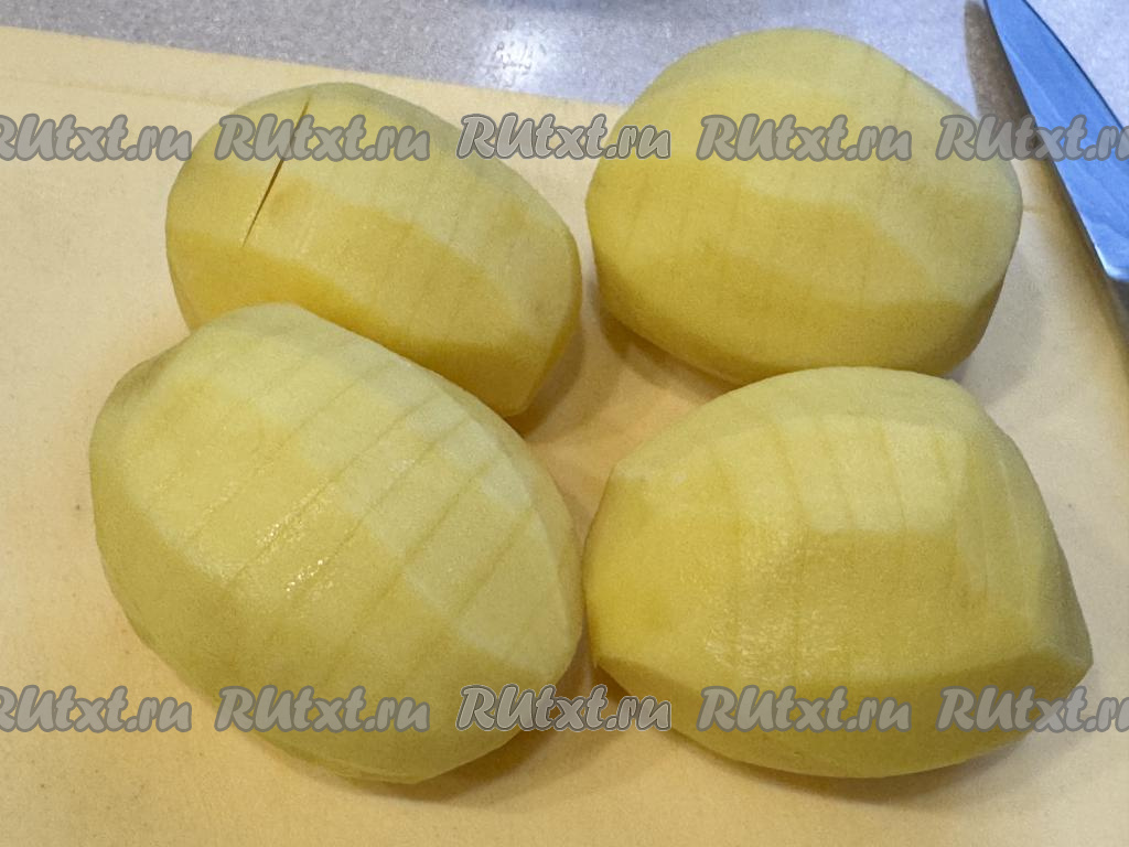 Сделать на каждой картошине глубокие надрезы, как бы нарезая картофель на тонкие ломтики, но не прорезая картофель до конца. В результате у нас получится картошка-гармошка, как на фото.