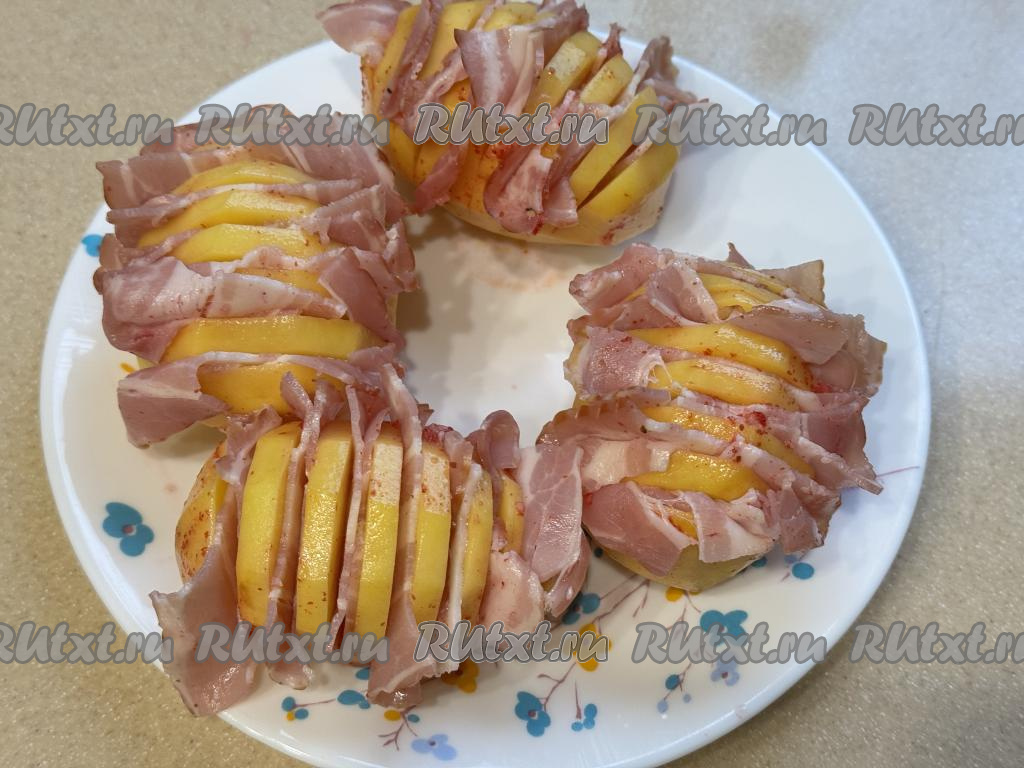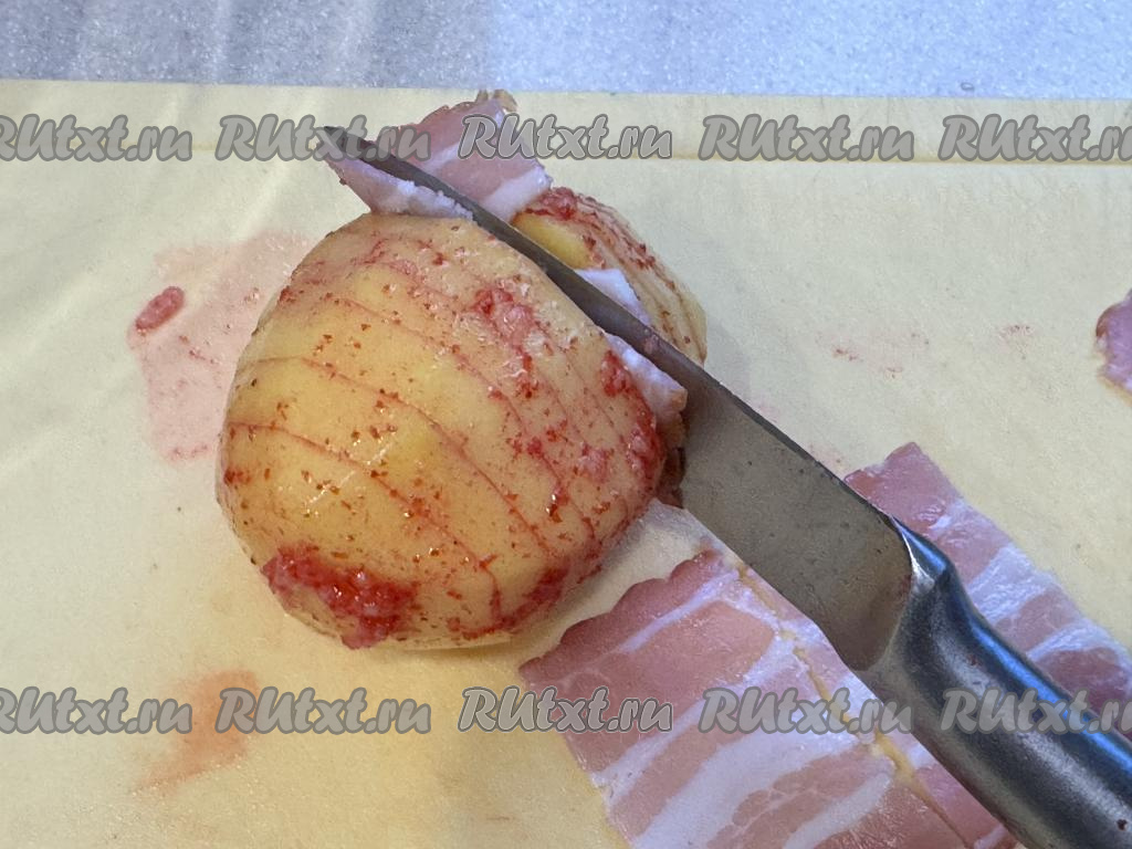 Полоски бекона нарезать на небольшие ломтики, с помощью ножа вставить бекон в разрезы картошки-гармошки.