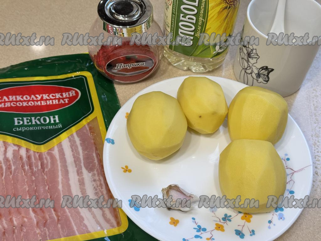 Подготовить продукты. Картошку почистить. Желательно брать картошины примерно одинакового размера. Бекон можно взять любой (у меня - сырокопчёный).