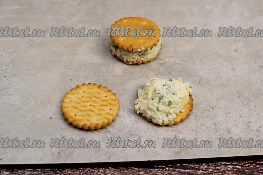 На крекер выложить часть сырно-яичной начинки, сверху положить второй крекер, слегка прижать получившийся бутерброд на крекерах.