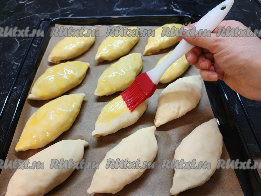 Выложить сформированные пирожки швом вниз на противень, застеленный пекарской бумагой. У меня все пирожки не уместились на противень, поэтому я выпекала в духовке их в несколько заходов. Для того чтобы готовые пирожки были покрыты приятной, золотистой корочкой, непосредственно перед закладыванием в духовку пирожки нужно смазать смесью из желтка и молока. Выпекать пирожки с капустой в духовке, заранее разогретой до 180 градусов, минут 30.