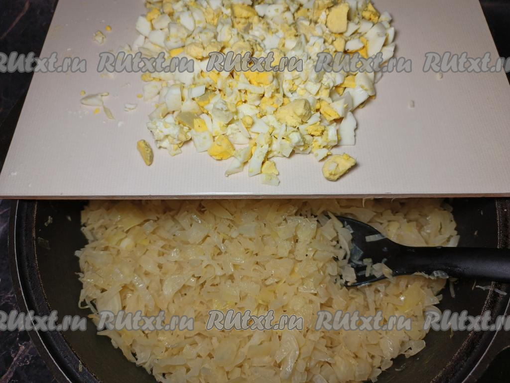Тушёную капусту снять с огня. Варёные яйца очистить от скорлупы, мелко нарезать, добавить к капусте, перемешать. Попробовать на вкус, если нужно, досолить. Оставить жареную капусту, смешанную с яйцами, остывать.