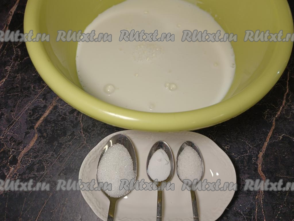 Кефир влить в глубокую миску, всыпать соль, сахар, соду, перемешать и оставить при комнатной температуре на время, пока будем заниматься начинкой.