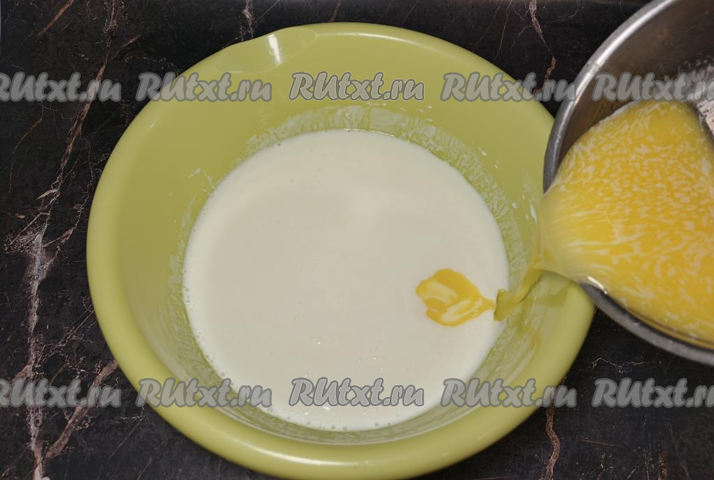 Пока капуста остывает, займёмся замешиванием бездрожжевого теста для пирожков. Сливочное масло растопить (растопить масло можно в микроволновке или на плите), дать немного остыть. Пока жарилась капуста, кефир согрелся, вошёл в реакцию с содой, поэтому его поверхность запенилась. В миску с кефиром влить растопленное негорячее сливочное масло, перемешать столовой ложкой до однородности.