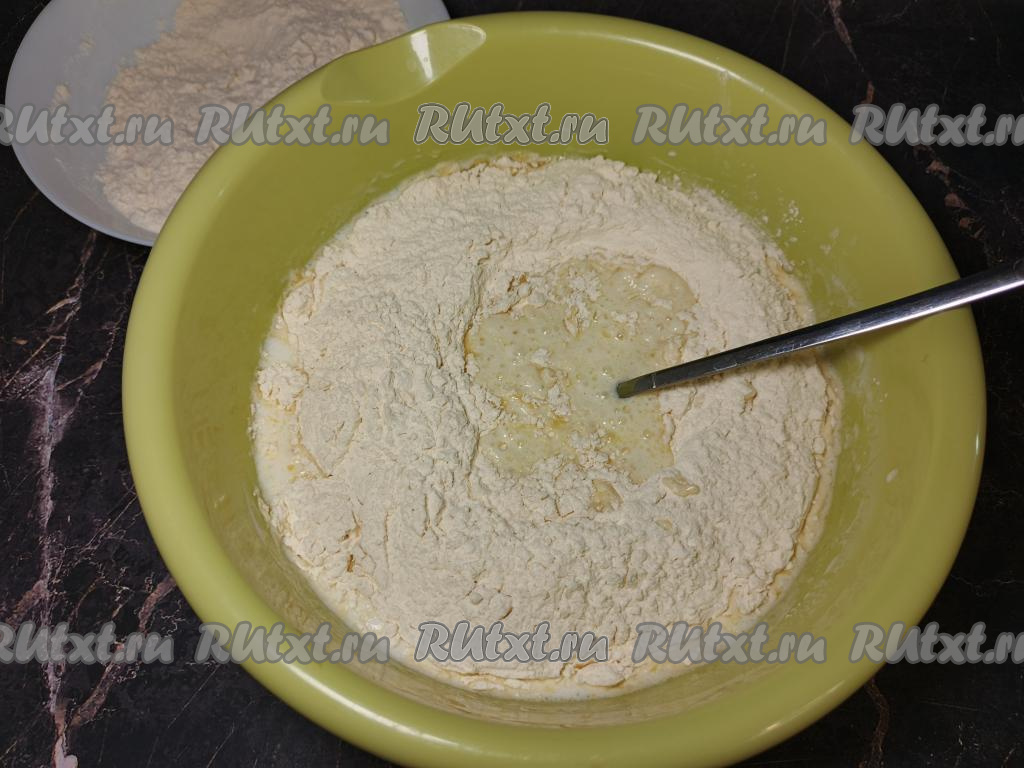 Частями начать добавлять в миску муку, каждый раз хорошо вмешивая её. Сначала перемешивать тесто ложкой, а когда оно начнёт собираться в шар, продолжать замешивать его руками, всыпая муку только по мере необходимости. Как только тесто станет мягким, не липнущим к рукам, больше добавлять муку не нужно.