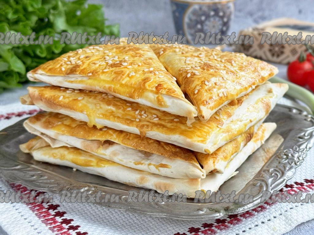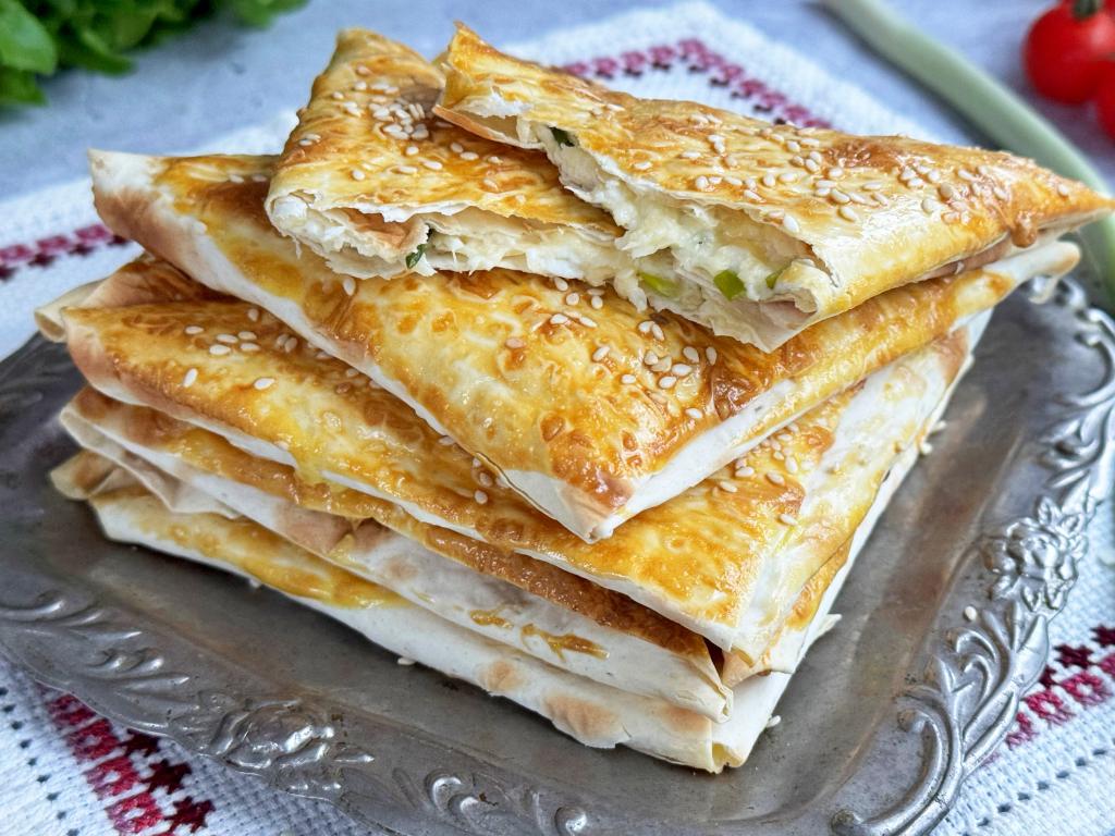 А вот как треугольник из лаваша выглядит в разломе. Расплавленная начинка из сыра, творога и зелени прекрасно сочетается с лавашом. Получается очень сытно и вкусно!