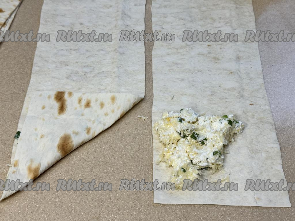 Лаваш нарезать на 8 полосок шириной ориентировочно 10 сантиметров. Ближе к одному узкому краю лаваша, немного отступая от краёв, выложить в виде треугольника 1 столовую ложку начинки из зелени, сыра и творога, как на фото, затем подвернуть чистую часть узкой стороны лаваша на начинку по диагонали.