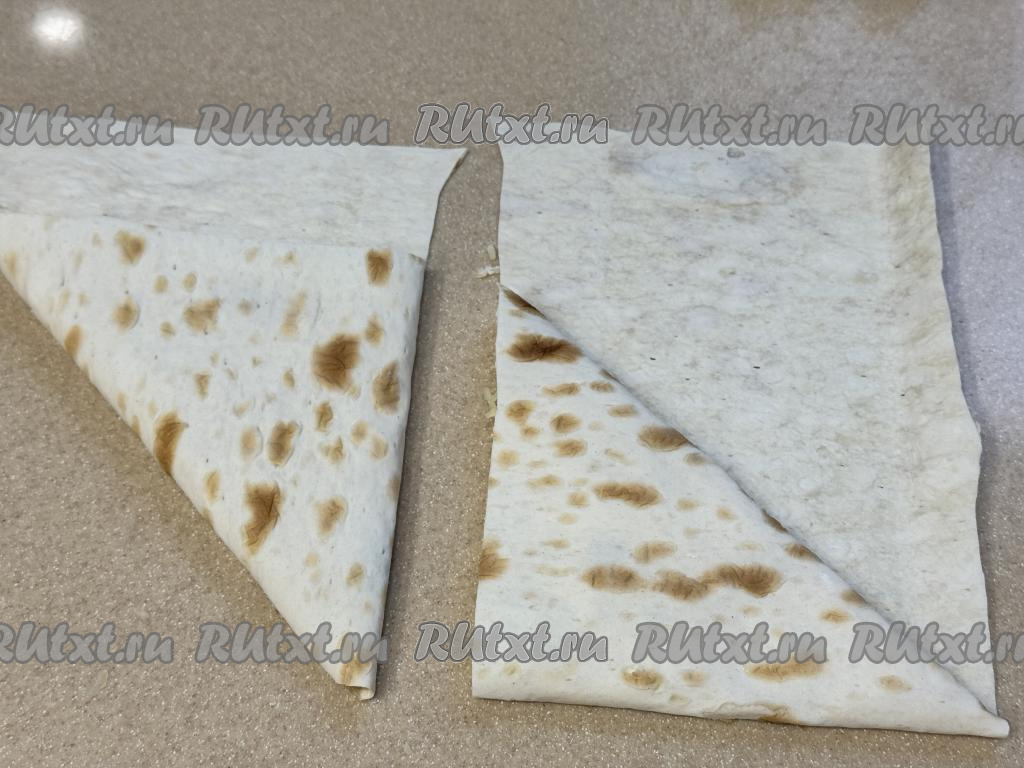 Начиная с подвёрнутого края полоски, подворачивать лаваш дальше, формируя треугольный конвертик. Оставшийся край лаваша завернуть внутрь треугольника.