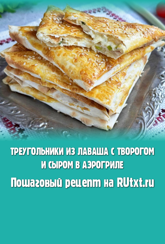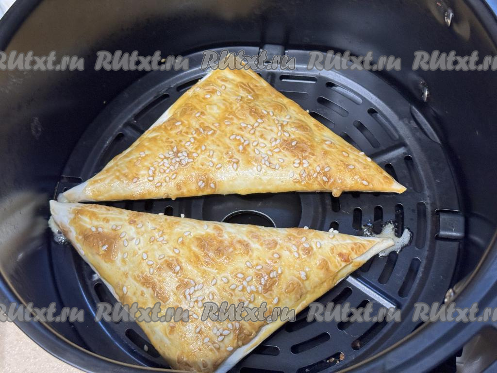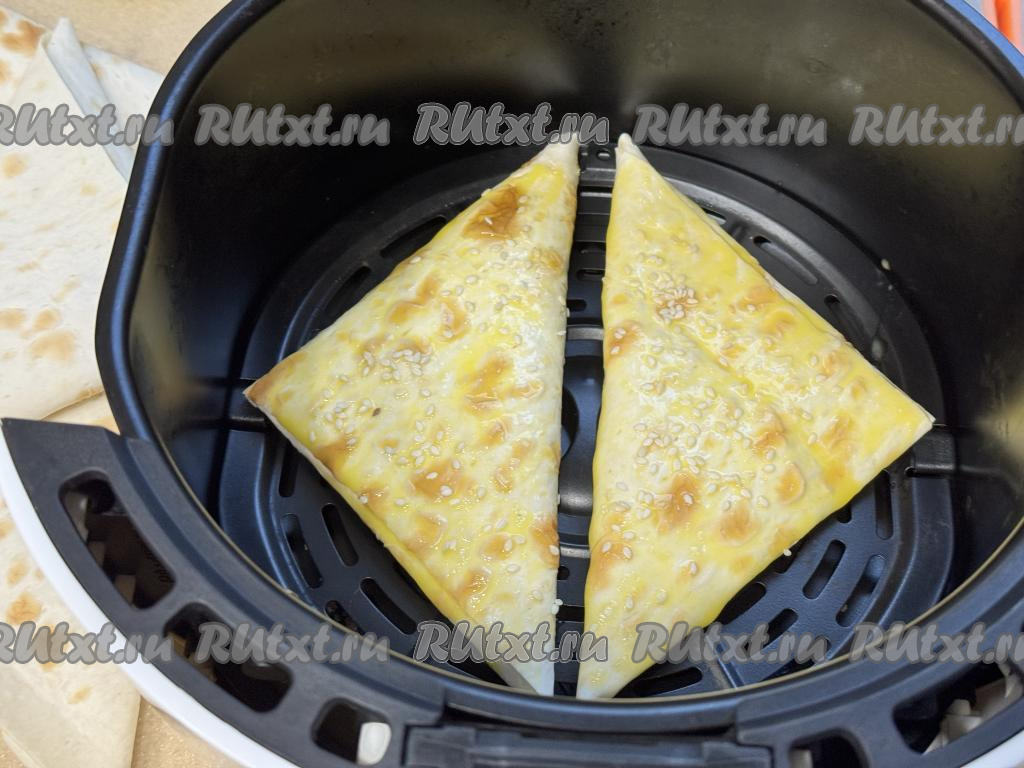Запекать треугольники в аэрогриле при температуре 180 градусов 10 минут (до золотистого цвета лаваша).